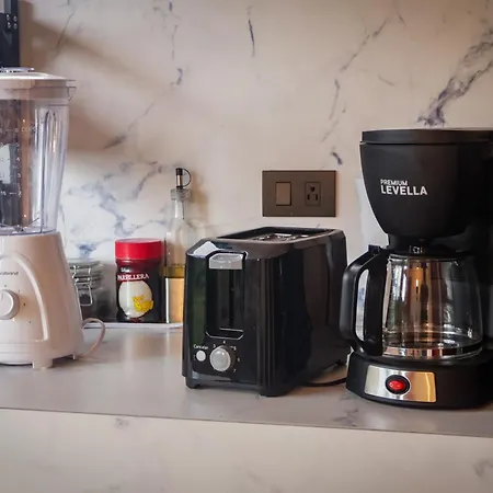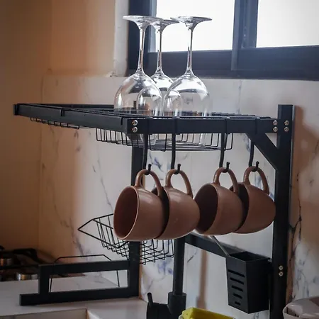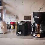 На кухне также есть кофеварка, духовка и стеклянная посуда.